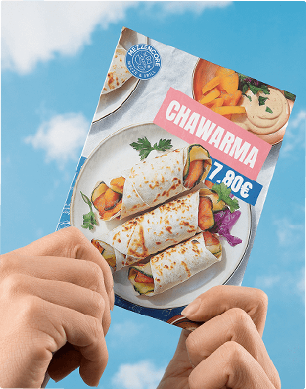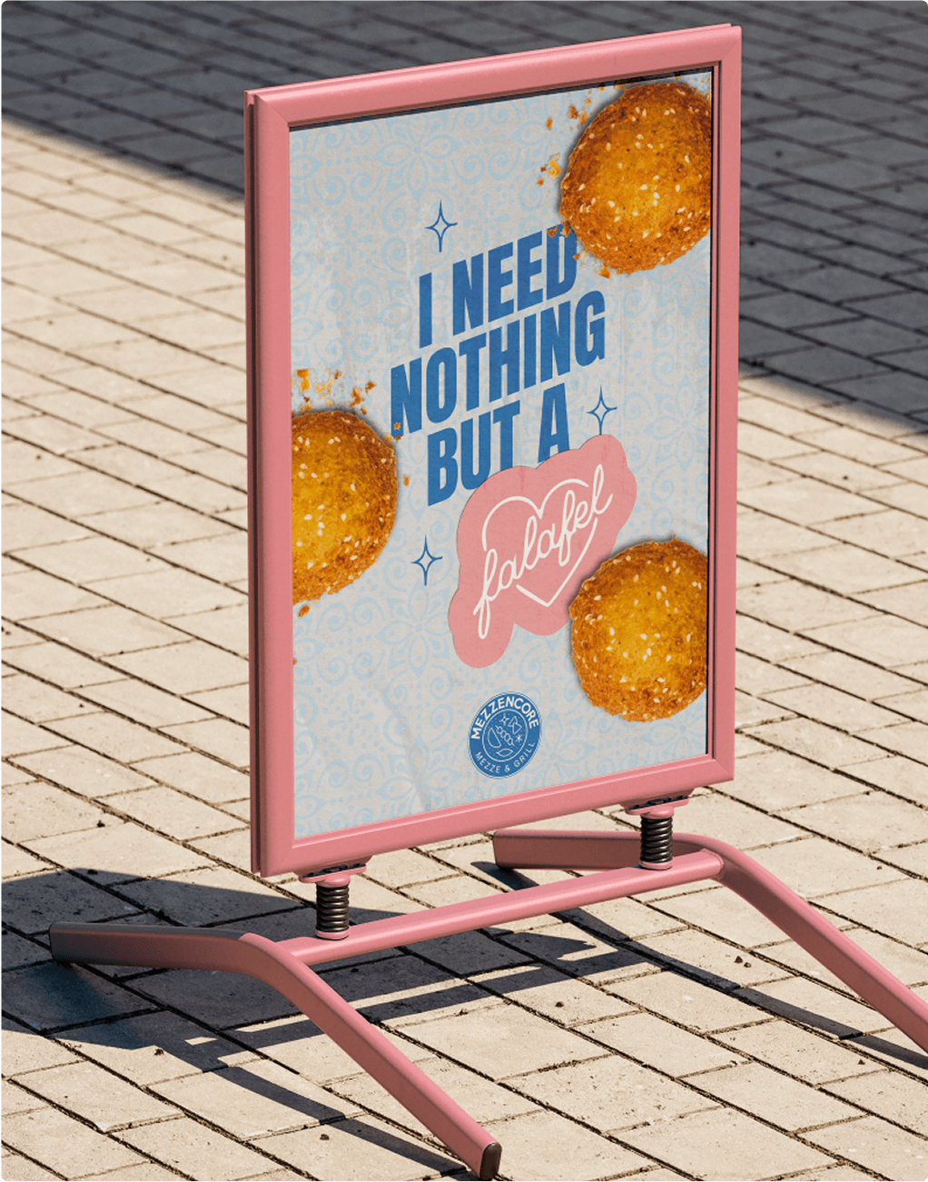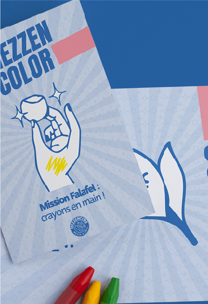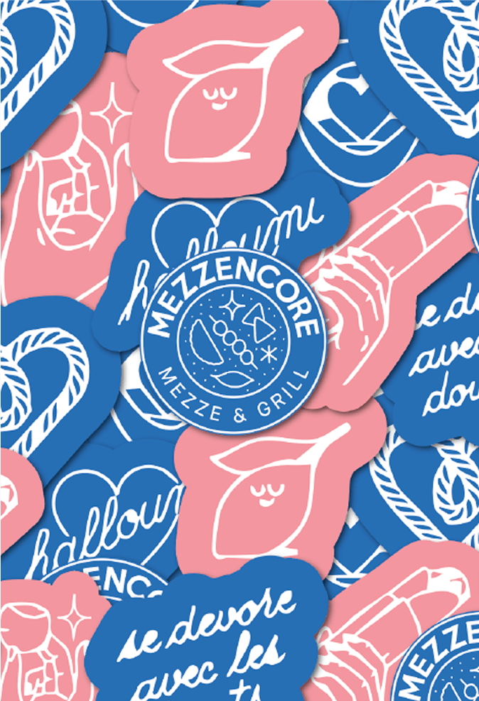 Les supports print ont été pensés comme des extensions tactiles de l’univers Mezzencore : chaleureux, artisanaux et généreux. Flyers, sets de table ou stop trottoirs reprennent les motifs, les illustrations et la palette de couleurs pour créer une cohérence visuelle forte en point de vente.